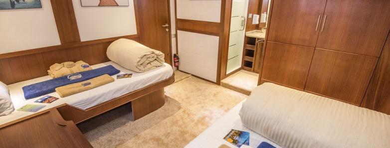 - A comfortable stateroom with two twin beds. Private head and shower, porthole windows individual climate control, monitor with media player and hair dryer.