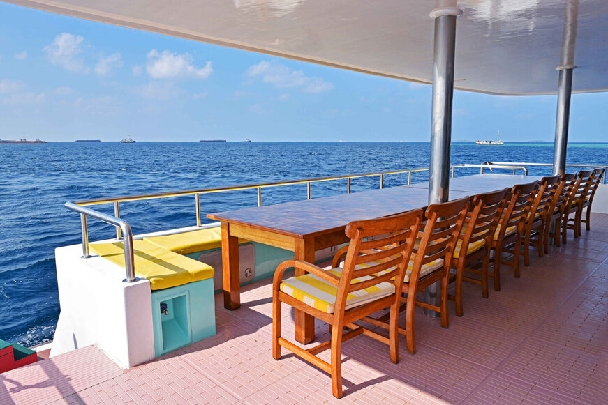The Blue Horizon III anchors near the Male International Airport. All guests are provided with transport from the airport via Dhoni.