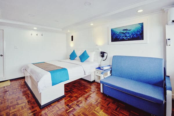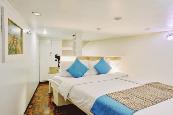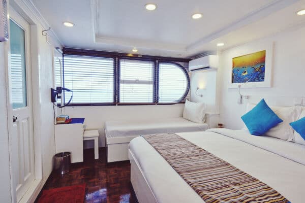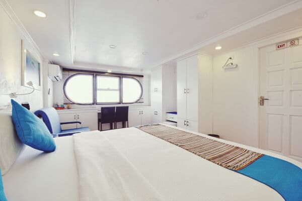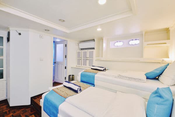 The Blue Horizon III accommodates 22 to 24 divers in 12 cabins. The 9 Twin/Standard Cabins contain double or twins beds, are fully air-conditioned and have plenty of storage. Maximum occupancy is 2 guests. The yacht also contains 2 Deluxe Cabins with a large sea view window. In addition to being fully air-conditioned, the cabins also have a massage shower and bathtub. The Deluxe Cabins accommodate 2 guests on a queen bed. The Blue Horizon also offers 1 Master Deluxe Cabin for 2 guests. The cabin also includes air conditioning, a private toilet, massage showers, and a bathtub.