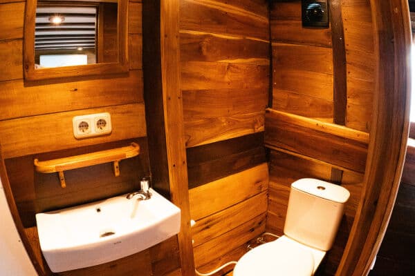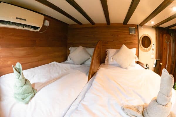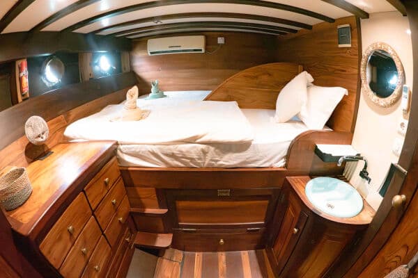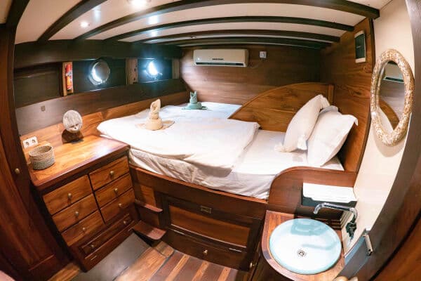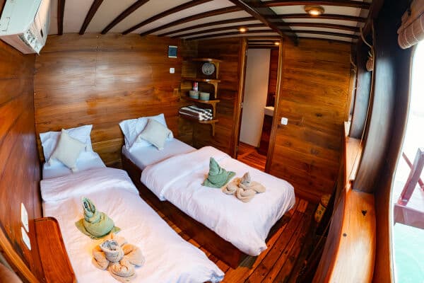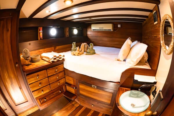 EcoPro Duyung Baru features four well-appointed cabins, each designed to provide comfort and tranquility for guests during their liveaboard experience. The cabins are equipped with individual air conditioning units, ensuring a pleasant environment in the tropical setting of Komodo, Indonesia. The vessel's commitment to an intimate experience is reflected in the limited occupancy of eight guests, allowing for personalized service and a sense of exclusivity.