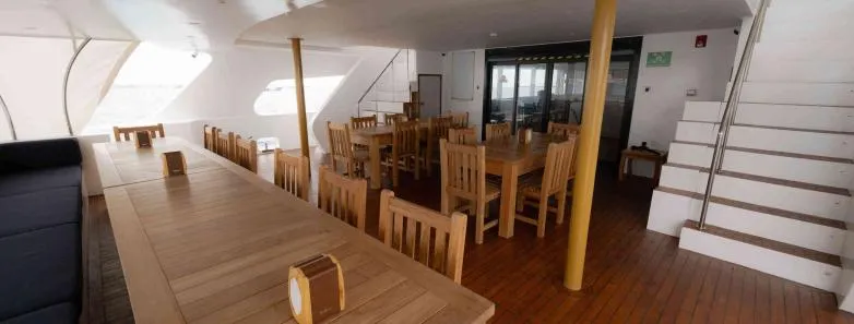 • The main deck offers a welcoming space for socializing, complete with a salon and bar. It also features both indoor and outdoor dining options, as well as a designated charging area for devices. There are 2 double bed cabins on this deck, each with an en suite bathroom, making it convenient for guests who prefer being close to shared areas.