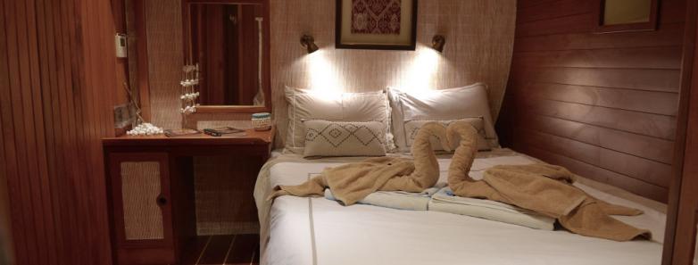 She comfortably accommodates 12 guests in 6 cabins (3 double bed cabins, 3 twin bed cabins), each with ensuite, mini safe, individually controlled air-conditioning and fan.