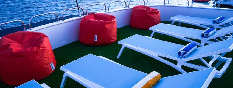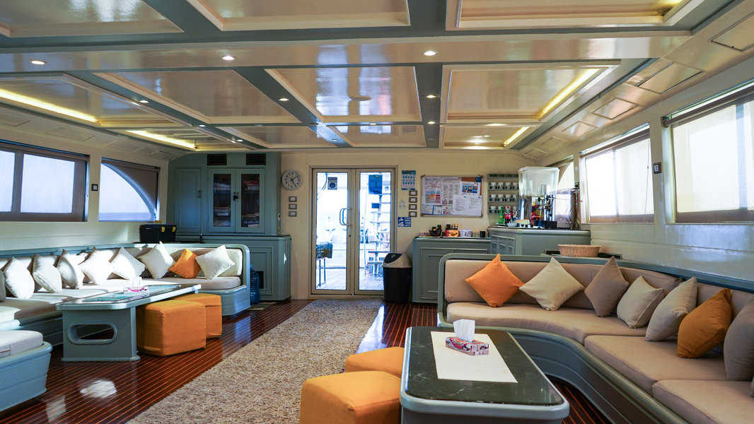 The Galaxy 720 Liveaboard offers guests two types of accommodations: Suites (3) or Standard Double Cabins (9.) The spacious Royal Suite is located on the Lower Deck, equipped with2 sofas and a separate walk-in shower cubicle in its bathroom. It is also equipped with a personal TV and DVD player. The remaining two King-Sized Suites are located on the Upper Deck and are outfitted with large windows overlooking the horizon. There is one Standard Double Cabin located on the Upper Deck, while the rest are located on the Lower Deck. All the Standard Double Cabins come complete with a personal unit air-conditioning and private bathrooms.