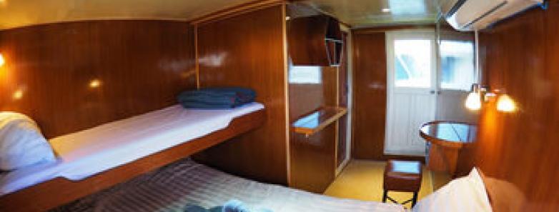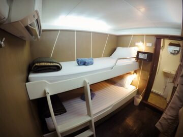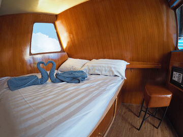 MV Gentle Giant can host up to 20 divers in fully air-conditioned, en-suite twin cabins, with three cabin types available: Master, Deluxe, and Standard. The Master Cabin, located on the upper deck, provides sea views, an en-suite bathroom, air conditioning, and a safety box. The Deluxe Cabin, found on the main deck, also offers sea views along with an en-suite bathroom, air conditioning, and a safety box. The Standard Cabins, situated on both the upper and main decks, share these amenities, including sea views and private bathrooms.