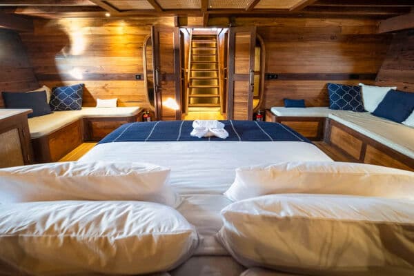 Majik Cruise can accommodate up to 8 adults and 2 children in 4 spacious and comfortable en-suite cabins. The two Master Cabins, one located at the aft and one at the front, each feature an Australian king-size bed and a sofa that can be used as a child's bed. The Master Deluxe Cabin at the aft offers exclusive access to the swimming platform. The other two cabins, located on each side of the lower deck, are Deluxe Cabins with a double bed that can be converted to twin single beds. All cabins are equipped with air conditioning, en-suite bathrooms with hot water and full toiletries, and 220V power plugs to charge electronic devices and cameras.