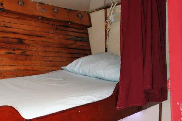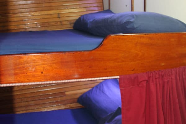 Sleeping Cabins 1-4 upper and lower bunks are single bunks with curtains for privacy. There is more privacy here but less space. 5 and 6 upper and lower bunks are double bunks meant for two people to share. This is typically where couples are housed. 7, 8 and 9 upper and lower bunks are in the main salon. These bunks are double wide but usually only sleep single passengers. There is less privacy here but more room. Think camping on the high seas only better!