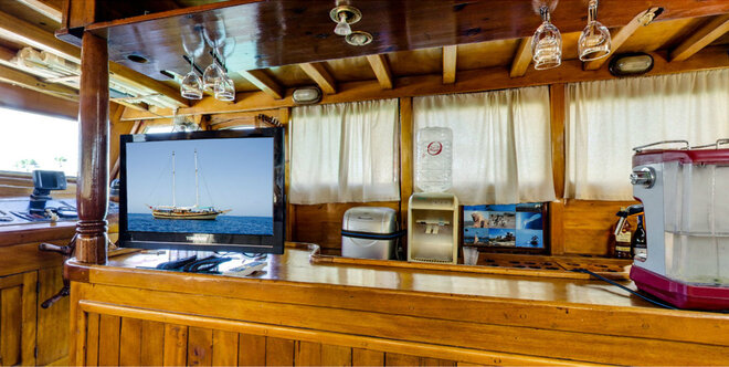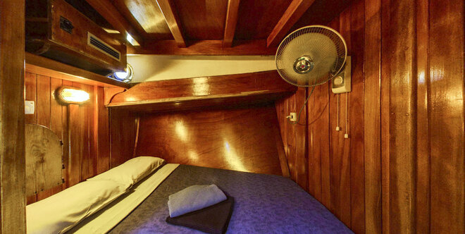 There are 7 double cabins with a private bath and shower and air conditioning for up to 14 guests.