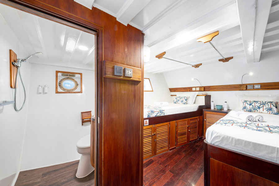 There are 8 cabins for up to 16 divers aboard the Seahorse, with 2 different cabin types to choose from, twin or double bed cabins. The cabins are located across the main and lower decks. The Main Deck Cabins are equipped with two sizeable windows offering a sea view. These cabins are just one step away from the boat's spacious camera room.