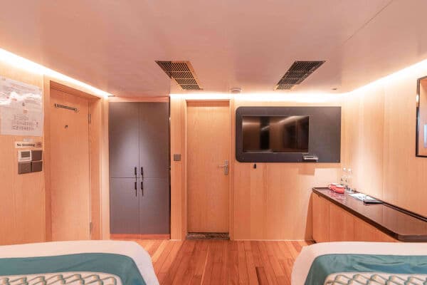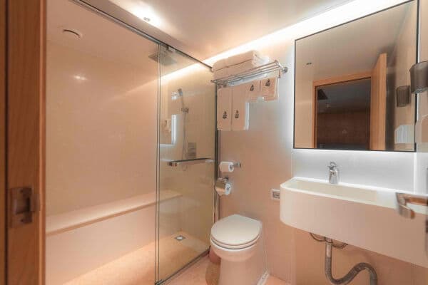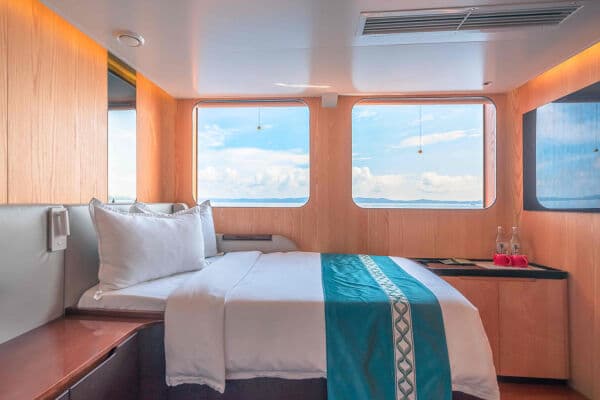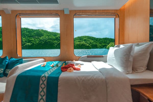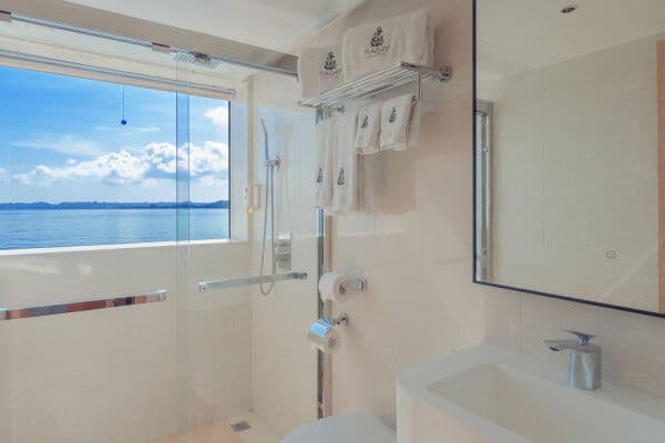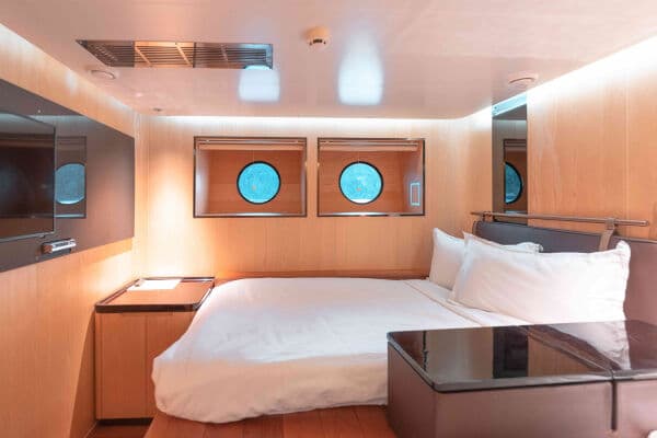The M/Y Black Pearl offers 11 twin cabins, providing comfortable sleeping arrangements for up to 22 guests. The upper deck features 2 Master Seaview Cabins with large windows, while the main deck offers 4 Seaview Cabins with equally large windows. The lower deck consists of 5 Deluxe Cabins, each with portholes. All cabins come with ensuite bathrooms, air conditioning, safety deposit boxes, reading lights, international plugs, and USB charging ports. This accommodation provides the perfect blend of comfort and convenience, ensuring a pleasant stay for all guests.