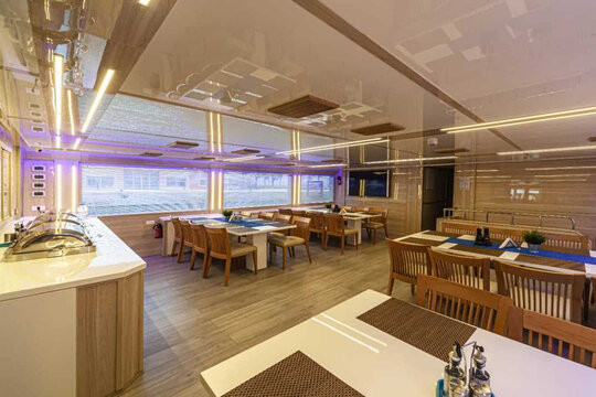 The Blue Storm liveaboard can accommodate up to 24 guests comfortably in 11 double cabins. Two of the double cabins can be outfitted with an extra bed to accommodate another guest.