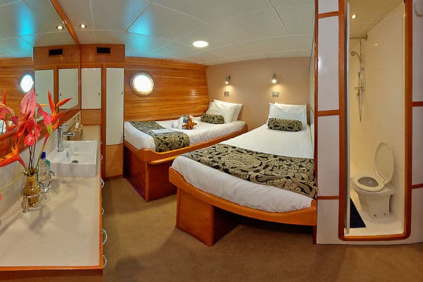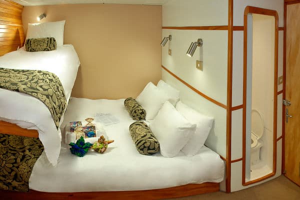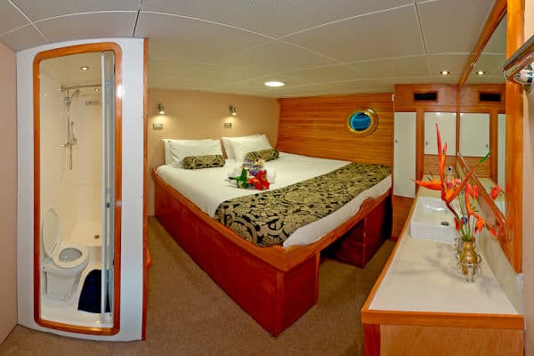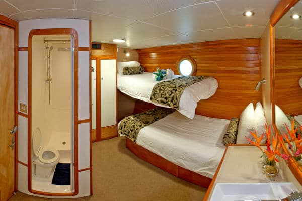 NAI'A has accommodation for 16 passengers in 8 air-conditioned staterooms with private ensuite heads. All the staterooms were entirely rebuilt in 2010. Three of the staterooms have king-size beds that can be configured as individual singles, two of the staterooms have both a king and a single bunk above at the foot; two staterooms have only a king bed, and two staterooms have twin bunk beds. All the staterooms are larger than those on most dive vessels, with plenty of storage for gear, and they are bright, airy, and comfortable.