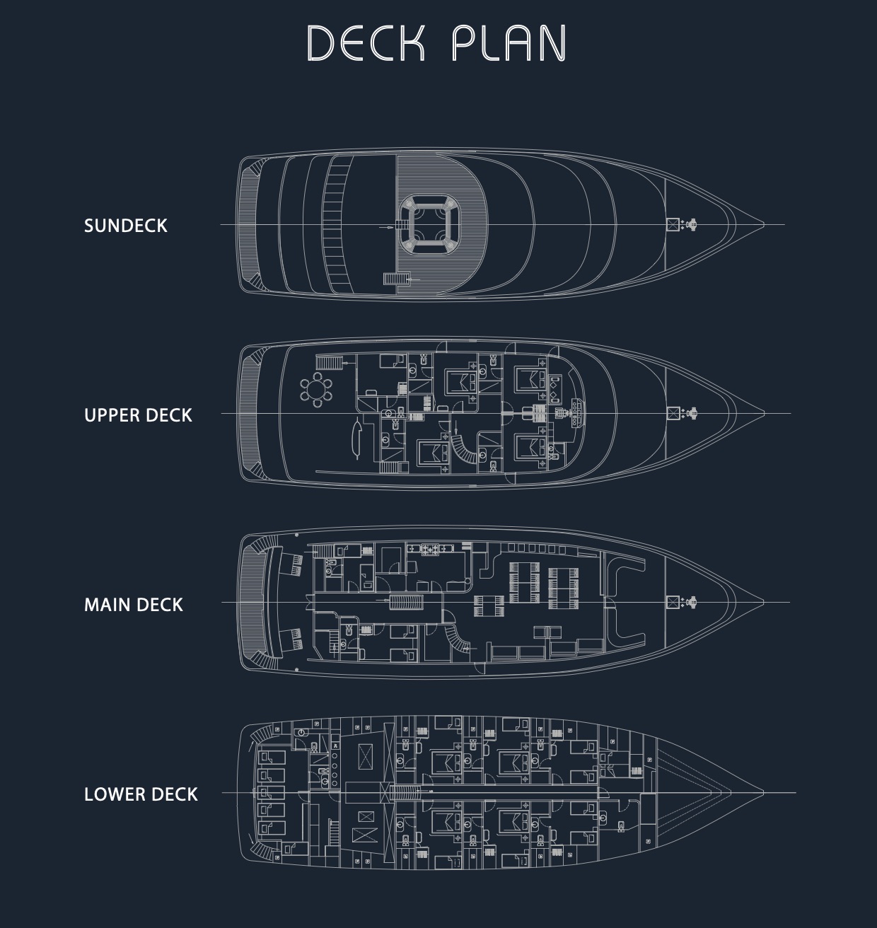 Made for the sapphire ocean it frequents, the Ocean Sapphire stands three decks tall, ready to cater to a diver's every need. This sleek yacht houses spacious cabins made for maximum comfort and other amenities that perfectly combine modern luxury with the polished interiors of natural teak and pine.