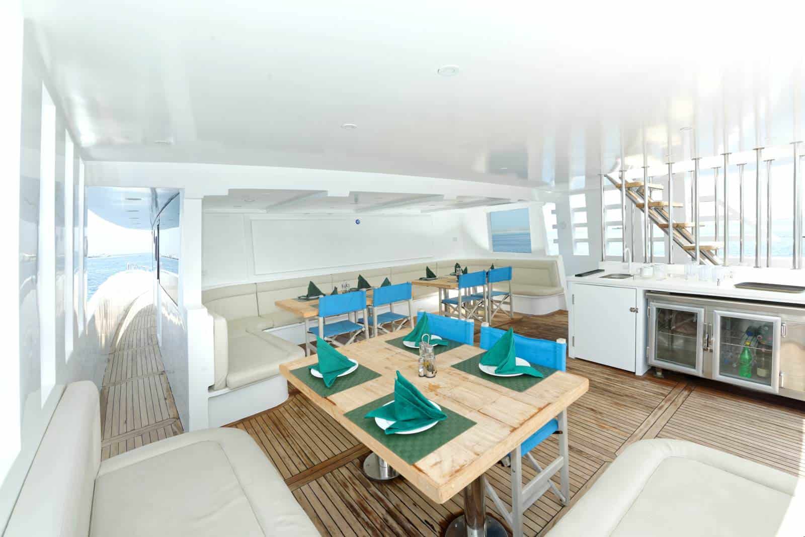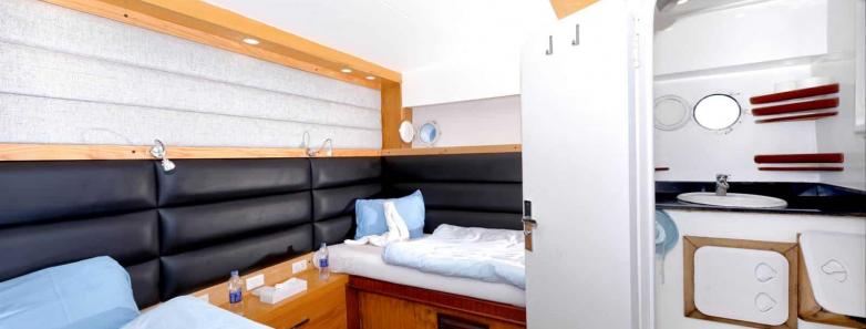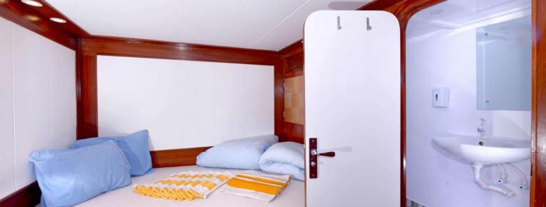 The Blue Pearl can comfortably accommodate up to 20 people in its 10 cabins. Eight of which are outfitted with twin beds, while the other two are outfitted with double beds and are located on the upper deck. All cabins come with an en-suite bathroom and are fully airconditioned.