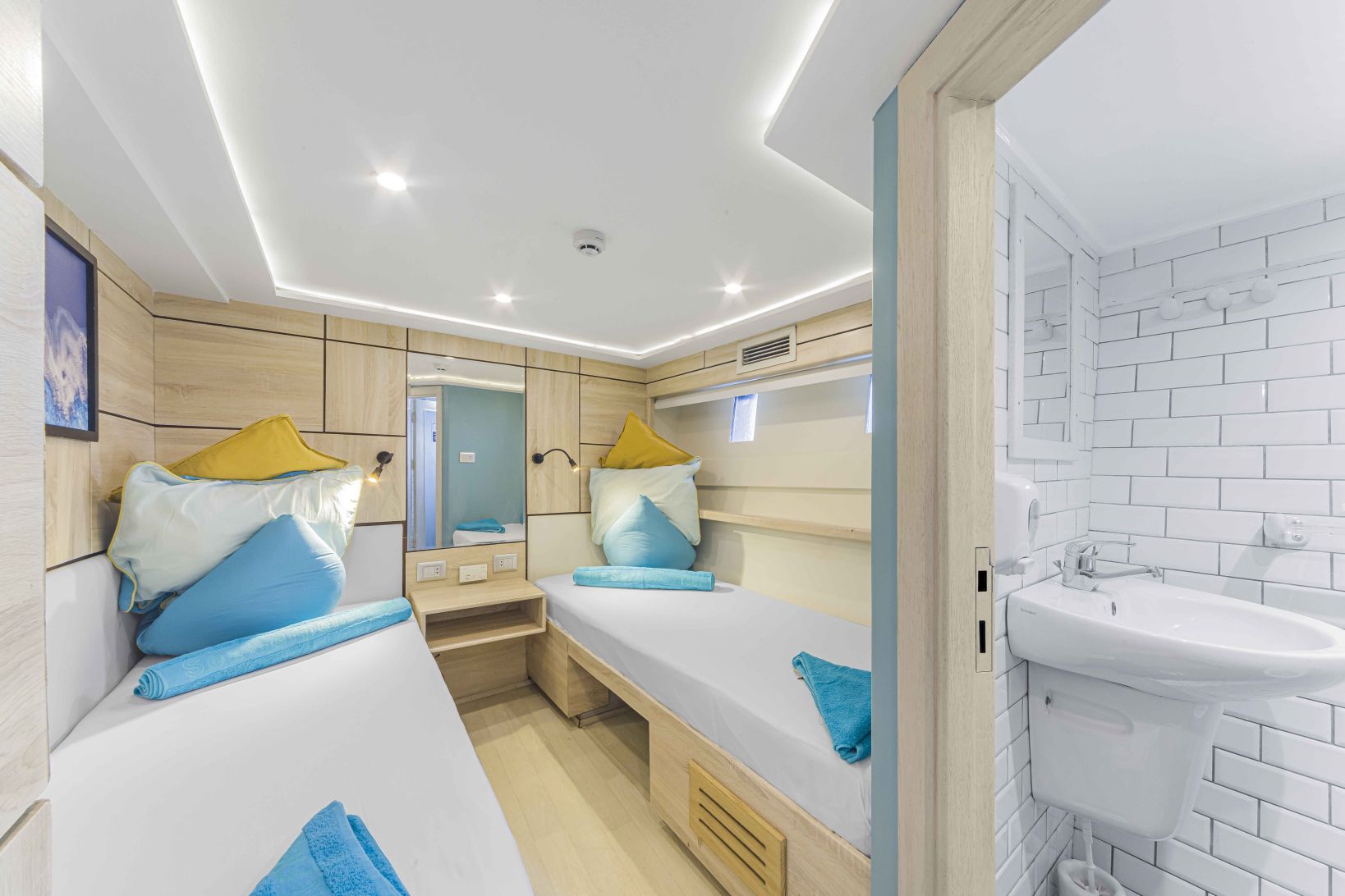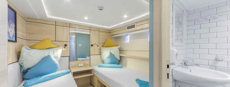 Accommodations are offered in 2 double bed cabins and 7 twin bed cabins. One of the double bed cabins and five of the twin bed cabins are located on the lower deck, while the rest are located on the upper deck. All the cabins come complete with air-conditioning, en-suite facilities as well as towels and bathrobes.