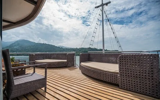 The Suite Cabins (Upper & Lower Decks) feature a 150 cm double bed with an extra bunk, air conditioning, and an en suite bathroom, with the upper deck suite offering sea views and a desk, while the lower deck suite provides extra space with a sofa and desk.