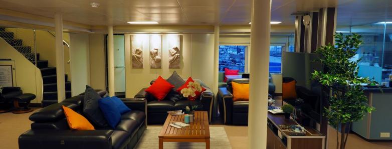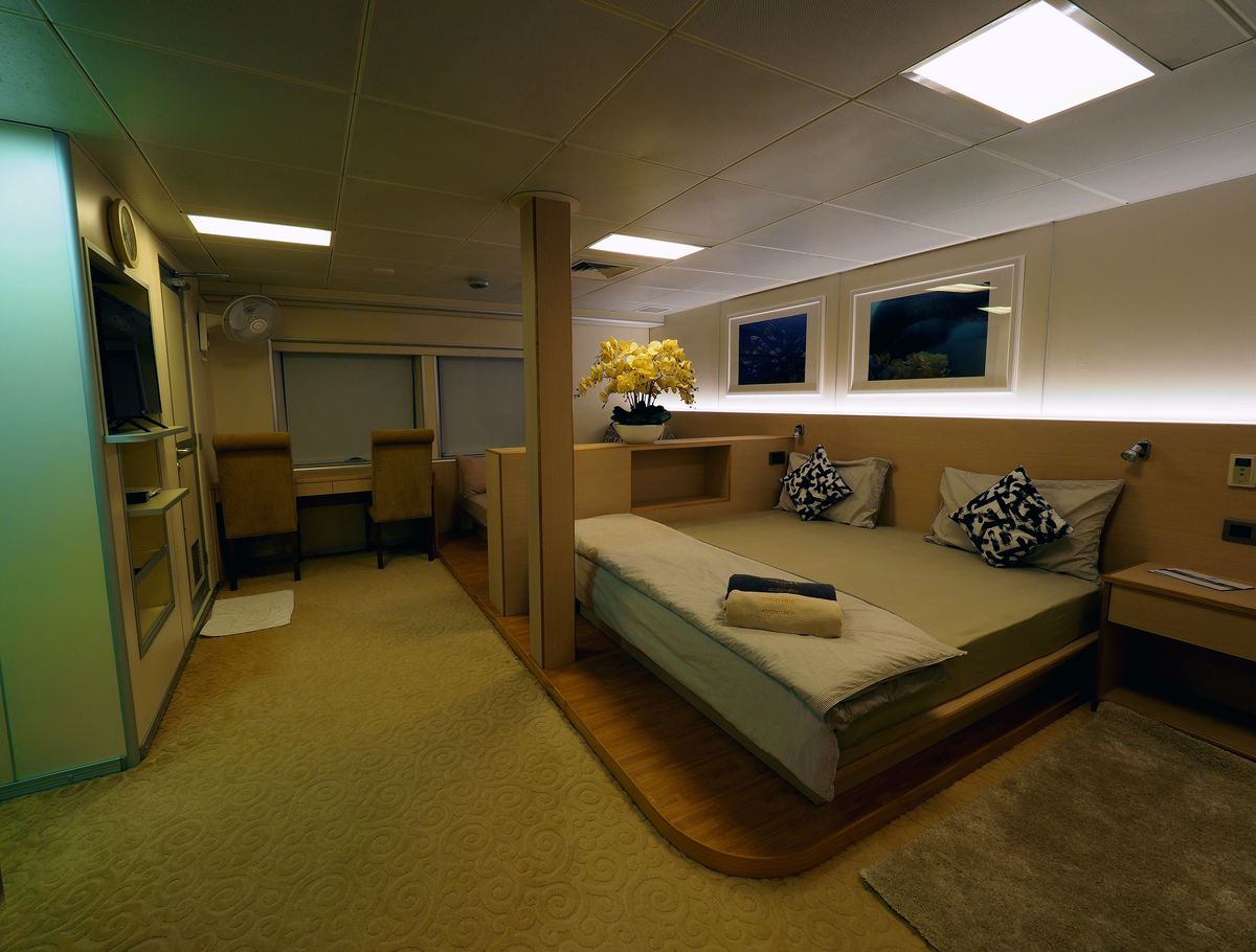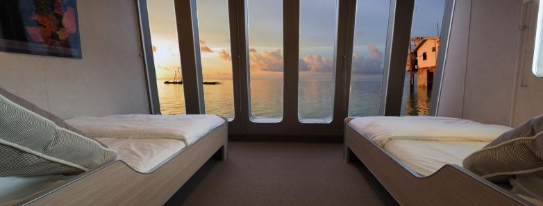 Solitude Adventurer is equipped with 8 cabins each featuring its own private view of the ocean. They offer 3 room types: One Stateroom, Six Deluxe Rooms, and One Quad Share Room. Each with copious amounts of space for your belongings as well as an en-suite bathroom with a hot water shower. Amenities include wardrobe, safe deposit box, hairdryer, bath/face towels, bath, and shampoo gel.