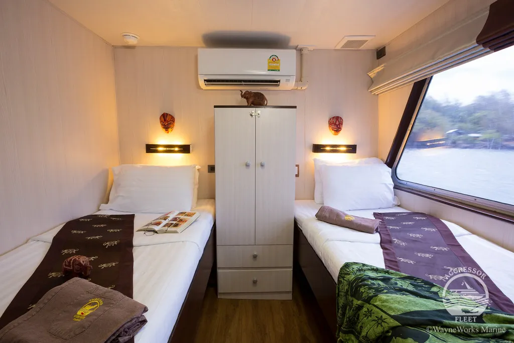 - Located on the lower Dolphin Deck, this cabin has a Queen Bed, Private Facilities with Bathtub and Portlight Views, Mirrored Cabinet, Wardrobe, Hairdryer, Bathrobes, Toiletries, Fresh Towels Daily, Independent Air Conditioning and Volume Controls and Monitor with Media Player.