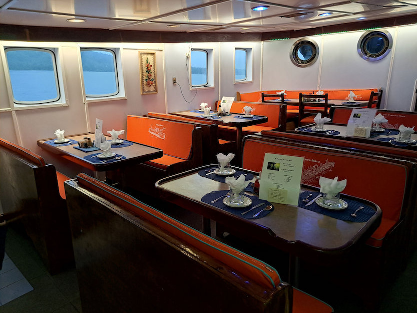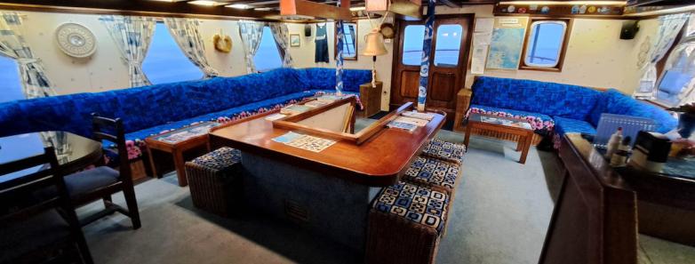 Ddeck forward interior with Dining Room, 5 tables seating 26 persons, adjoining galley and pantry, view windows, bookcase, stairs to crew area