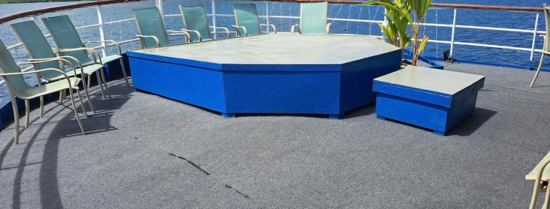 B deck with navigation bridge forward, chartroom/business center, liferafts, emergency beacons, dive launch storage, aft sundeck with lounge chairs and shade canopy