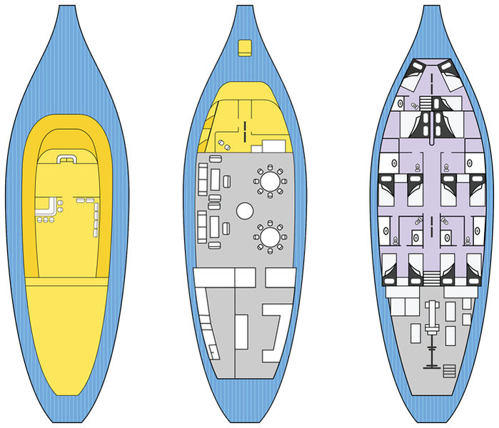 12 divers are accommodated in 6 spacious cabins. Cabin configurations provide numerous options, with four spacious twins and two doubles that feature roomy queen-size beds. All cabins are en-suite, with hot-water showers, convenient hairdryers, individually controlled air-conditioning, and minibars.