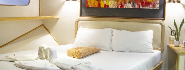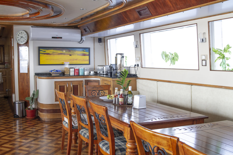 The boat has a total of 12 cabins, of which 11 cabins are allocated for guests. All cabins are airconditioned, equipped with a minibar, safe and ensuite shower and toilet.