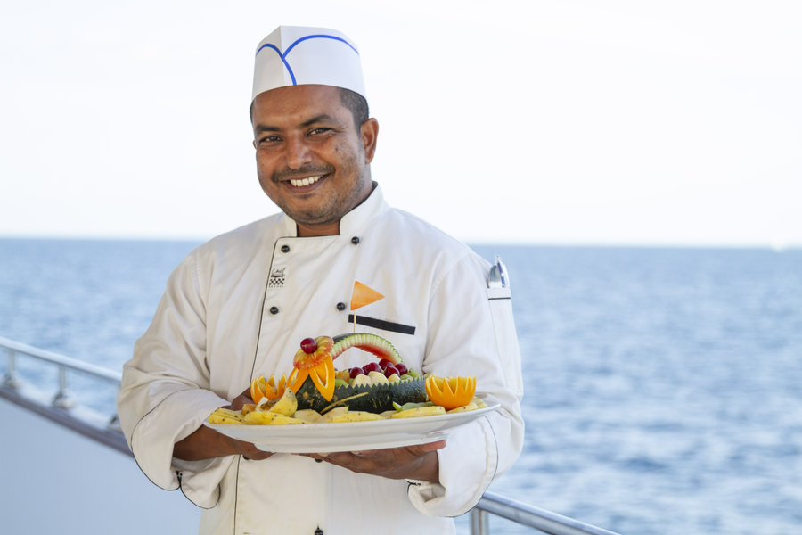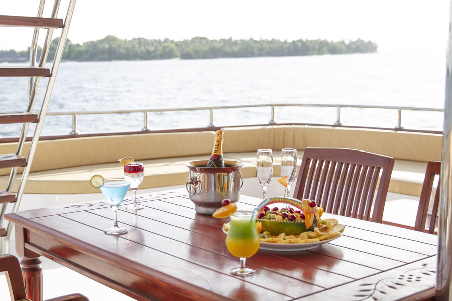 Mouth-watering cuisine with international dishes (Maldivian, Asian, European). Vegetarian dishes & alcoholic beverages available. Gourmet dishes (lobster, fish, wahoo, yellowfin tuna and other seafood) not included in the standard menu are also available.