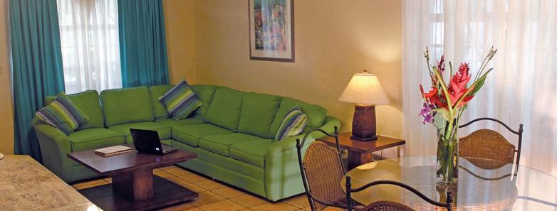 A spacious 525–560 sq ft villa featuring a king or queen bed, sofa bed, fully equipped kitchen, and views of lush gardens or poolside