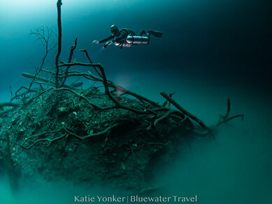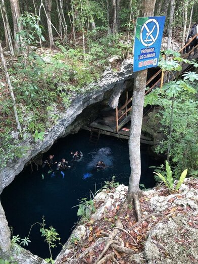 Our final day of diving began at the popular Cenote Angelita. The main draw here occurs at 95 feet deep where a hydrogen sulfide layer separates the freshwater above from the saltwater below, creating the appearance of an underwater river. Our final dive of the trip took place at the lesser-known Cenote Tajma Ha which has everything you could want in cenote: haloclines, stalactites, stalagmites, speleothems, sunbeams, fossils, and even bats! Take note - the up and down profile of this dive might make it challenging for newer divers or those with sensitive ears.