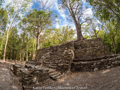 Our trip began in Cancun, an easy flight from many major cities in the US. We were picked up in a comfy van plenty big for the seven of us and all our gear, and began the drive to Xcalak. To break up the 5+ hour drive, we planned a stop at the beautiful Muyil ruins. One of the earliest and longest inhabited ancient Maya sites in the Yucatan, Muyil is situated within the Sian Ka'an Biosphere Reserve and contains the ruins of 22 pre-Hispanic settlements. This enchanting historical site is far less busy than Tulum, making it the perfect place to stop and explore. After a hot and humid walk through a densely packed jungle scattered with ruins, we boarded the van and continued on to Xcalak.