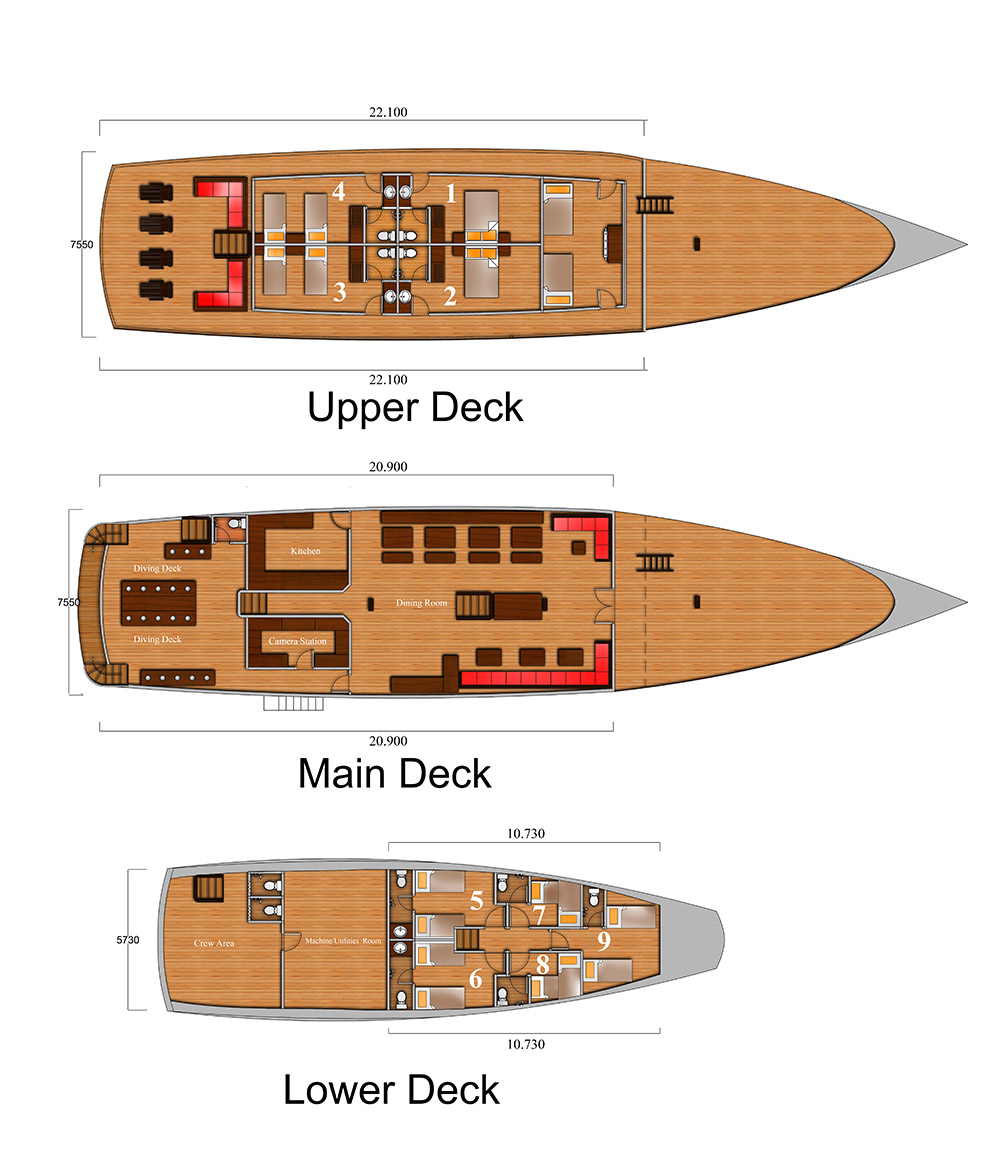 Mola Mola 1 Liveaboard is equipped with 8 beautifully appointed air-conditioned cabins, consisting of 2 double bedrooms and 6 twin bedrooms, each with its own ensuite bathroom and hot water shower.