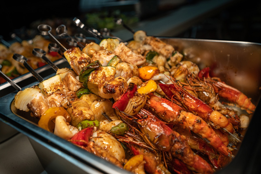 Our onboard chef creates a delicious mix of traditional and international cuisine cooked fresh every day with locally sourced ingredients. Vegetarian options are available.