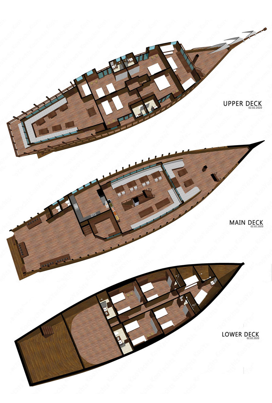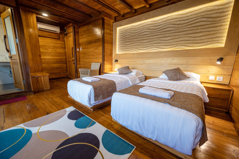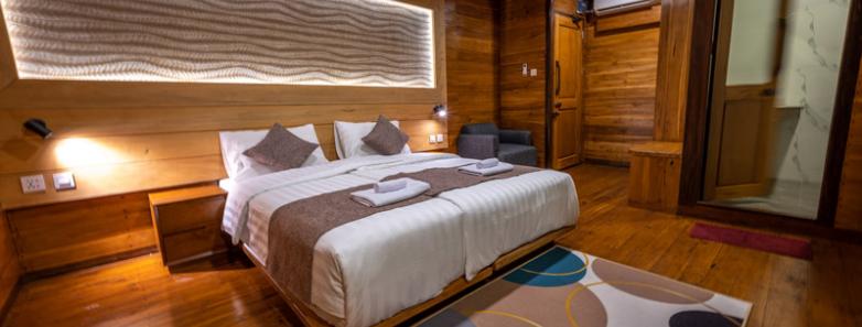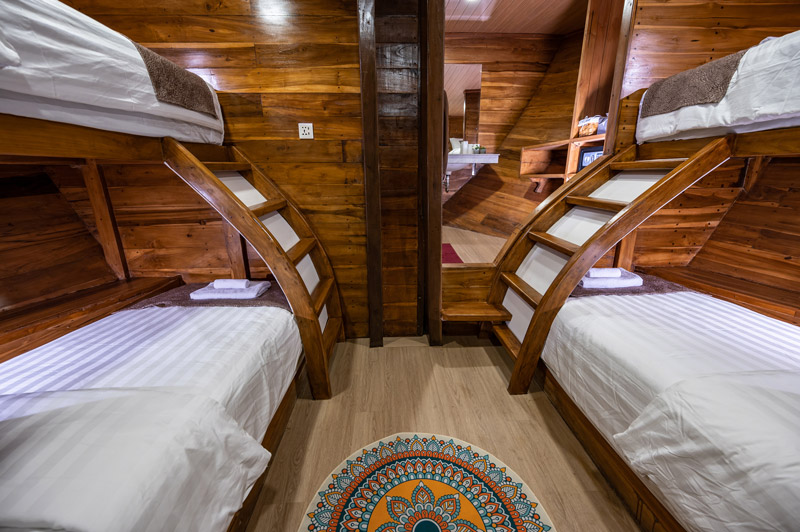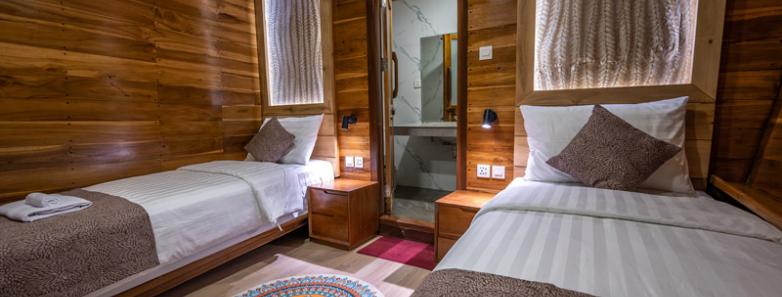The upper deck offers 2 double bedrooms and 2 twin-bedrooms, and the lower deck has 4 twin bedrooms. The lower deck also contains a quad room with bunk beds which can accommodate 4 guests.
