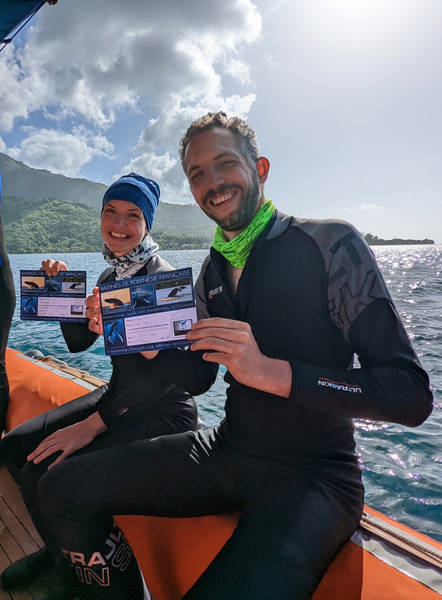 The morning of day two started with partly cloudy skies and glassy calm surface conditions, making it easy to spot the telltale spouts that erupt from the humpbacks blowholes as they surface to breathe. Our eagle-eyed guide, Teranui, slipped into the water, and soon spied a pair resting at depth, at which point he held up a raised fist, the signal that the animals were stationary. It was time for everyone to get in the water.