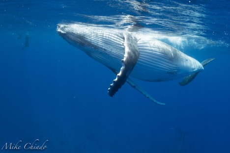 The second day on the water brought a couple ofmalessocializing with a female, involving lots of tail slapping on the surface. Our crew deemed the event too risky for us to enter the water. After the slapping died down we entered the water only to have the whales swim away.
