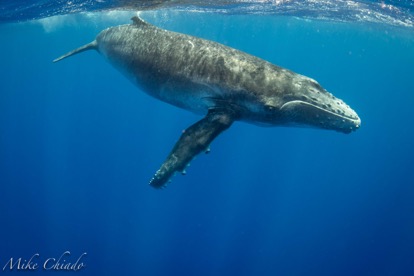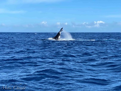 The days began with the crew making contact with other boats for any reports of whales around Moorea. Using noted sightings, we set off looking for signsbreaches, tails sticking up as the whales dive, or water spouts. Once a whale or a tell-tale sign was spotted, the boat approached. If no other activity was noted for a period of time longer than the length of time a baby humpback can stay underwater, the guide would swim to the area for a closer look. If the guide spotted a whale, our group got in the water and headed toward the guide. Once near the whale, we wouldposition ourselves near the head of the whale and hope she/he would surface near us. Sometimes we were lucky, other times the whale would just continue moving underwater and surface far from us.