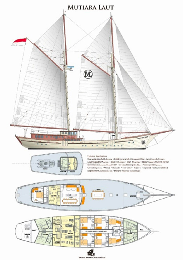 The strikingly elegant Mutiara Laut is a unique 46m long and 9m wide liveaboard with a design based on a traditional British schooner combined with elements of the Indonesian phinisi. With over 850m2 of sail, she boasts real sailing capabilities while coming equipped with modern engines and generators and all the latest in safety equipment and instrumentation. Built for comfort, she offers year-round diving and leisure trips in far-flung areas of the Indonesian archipelago that are slowly becoming known for some of the best diving in the world.
