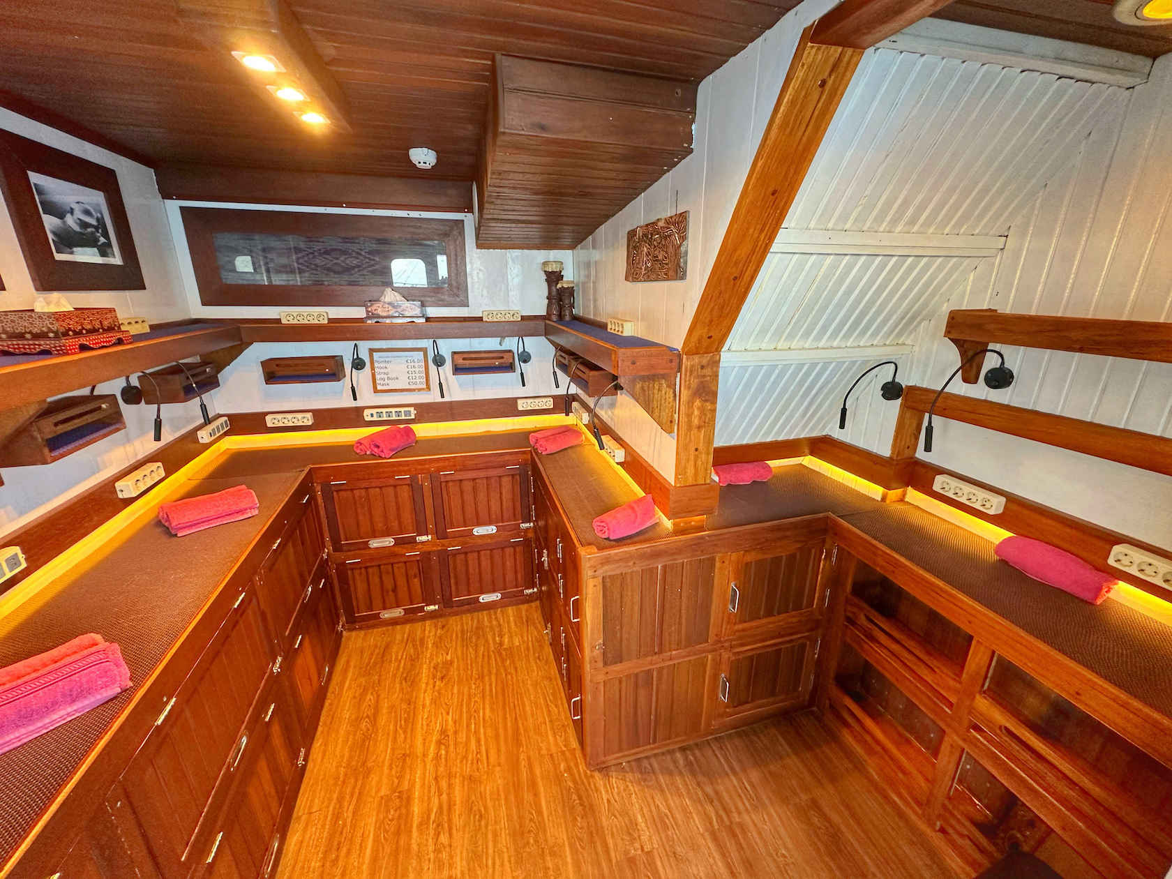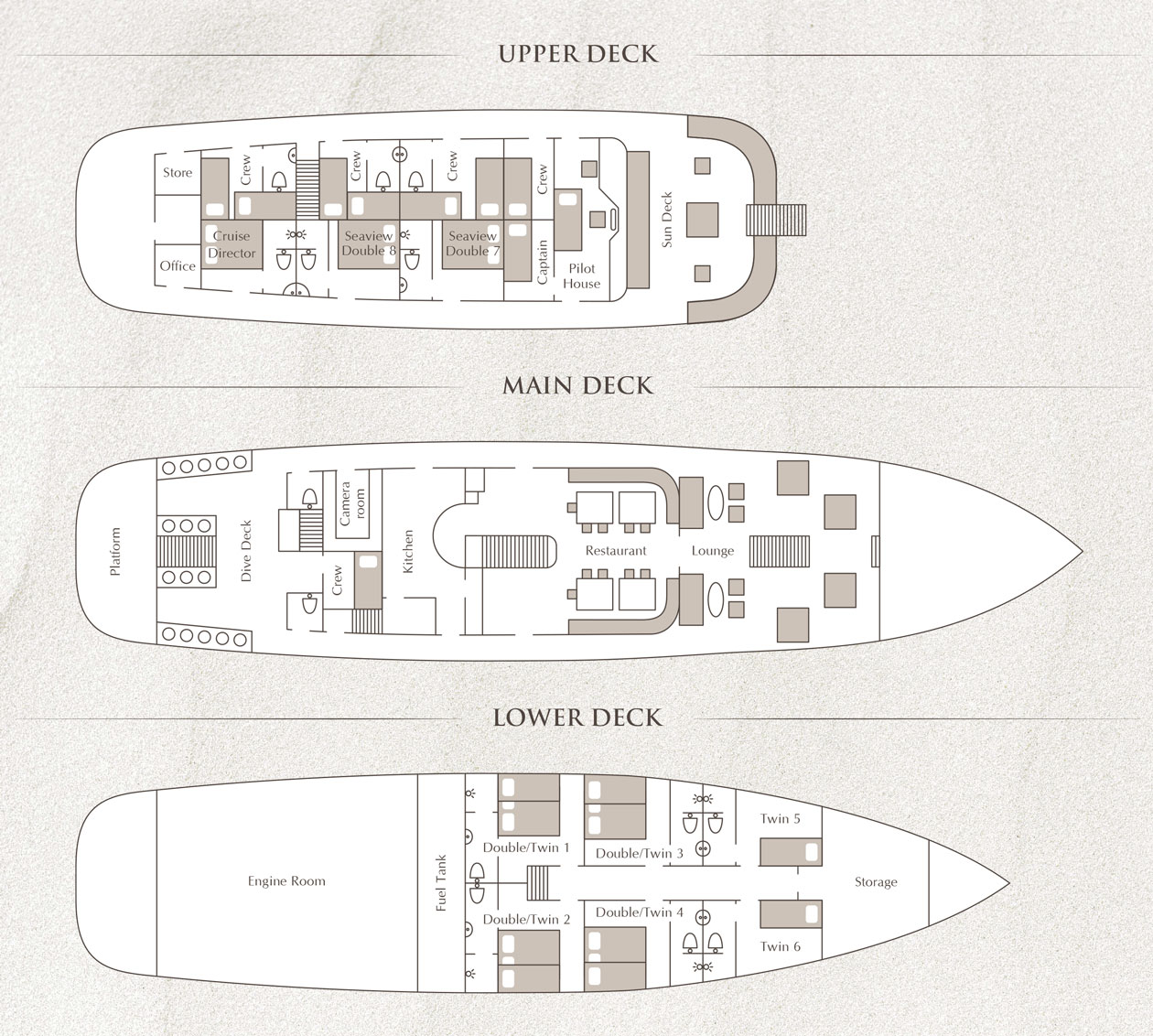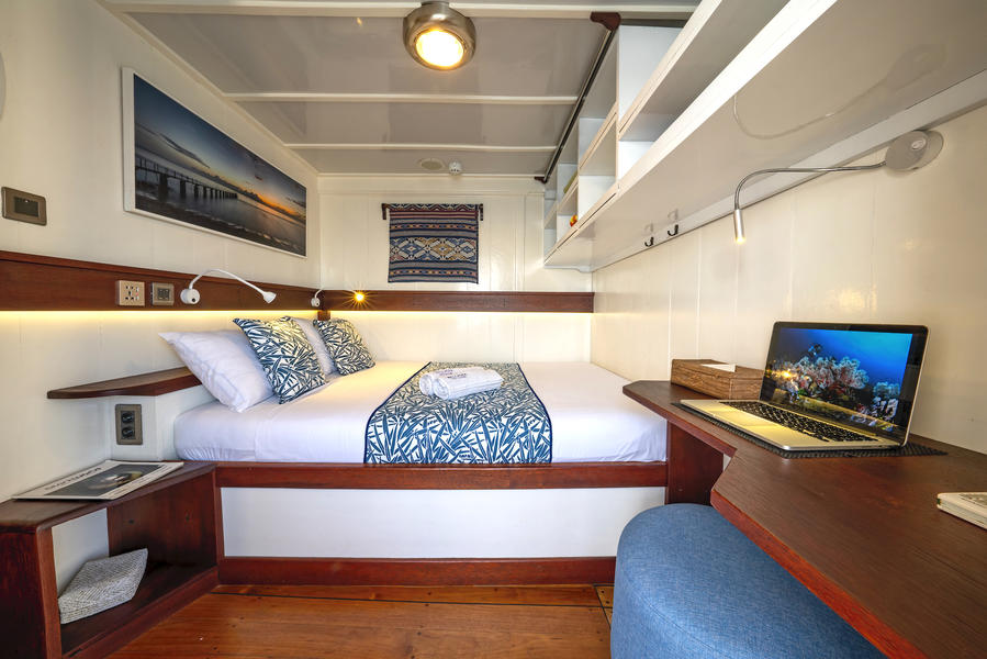 The MV Ambai has 8 cabins accommodating 16 passengers. All cabins have individually controlled A/C units and private ensuite bathrooms. Room options include bunk and double-bed cabins.