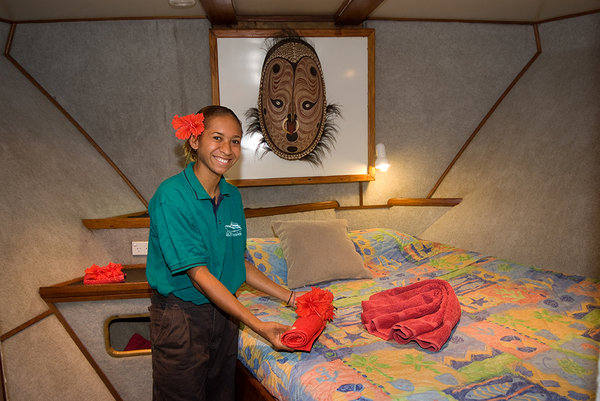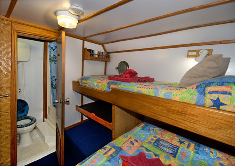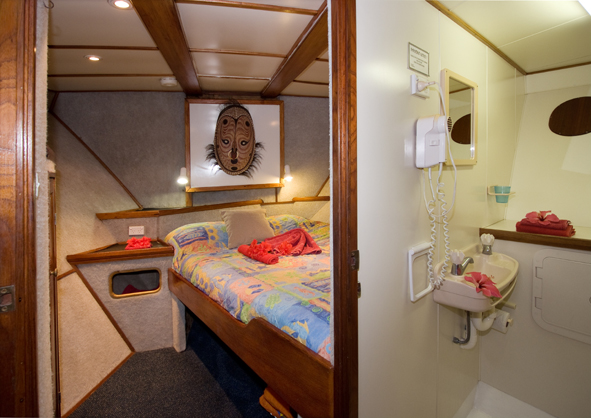 The MV FeBrina has 7 cabins that comfortably accommodate up to 12 divers. All cabins have ensuite facilities and individually controlled air conditioning. Towels are changed daily (unless requested otherwise) and the rooms are laid out to maximize space and storage of personal items. Guests may choose between a double cabin, four twin cabins or two single cabins, providing flexibility for both individual and group travelers.