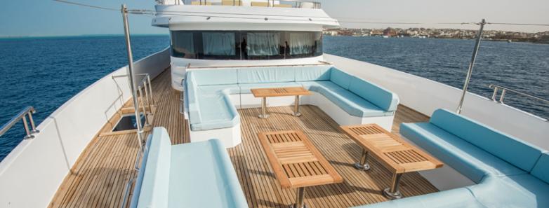 This vessel with a total of 14 staterooms split into two large suites, 2 double cabins and 10 twin cabins, can accommodate up to 22 divers including 3 professional guides for each dives. All rooms feature air conditioning, stereos, personal fridges, and an en-suite bathrooms with jet showers. There is plenty of space onboard, both on the dive deck and in the extensive and welcoming main deck salon with a separate dining area.