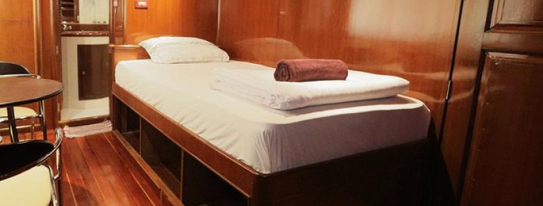 The main deck has 2 Master queen-sized bed cabins located at the bow, and 10 Standard twin bunk bed cabins. There is 1 VIP Single bed cabin located on the upper deck.