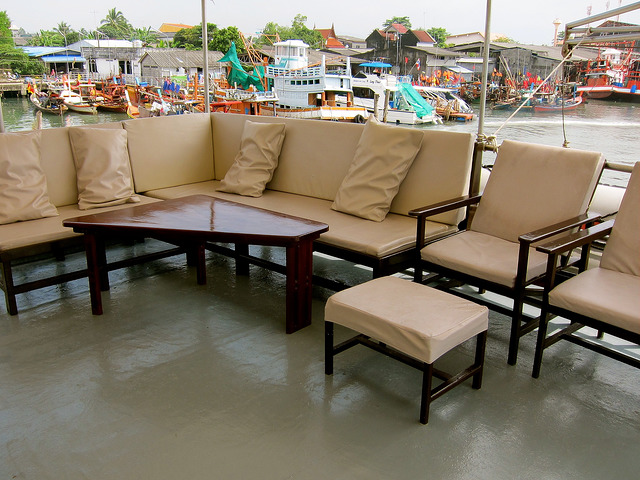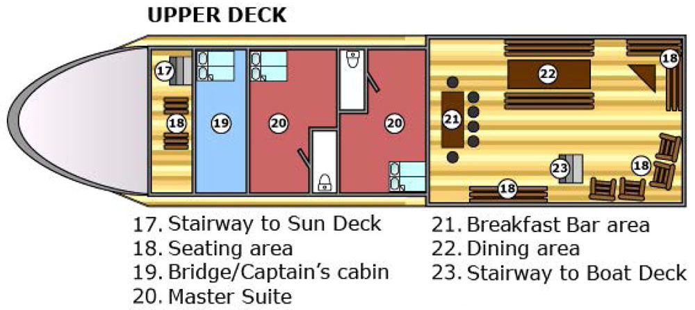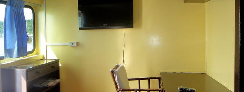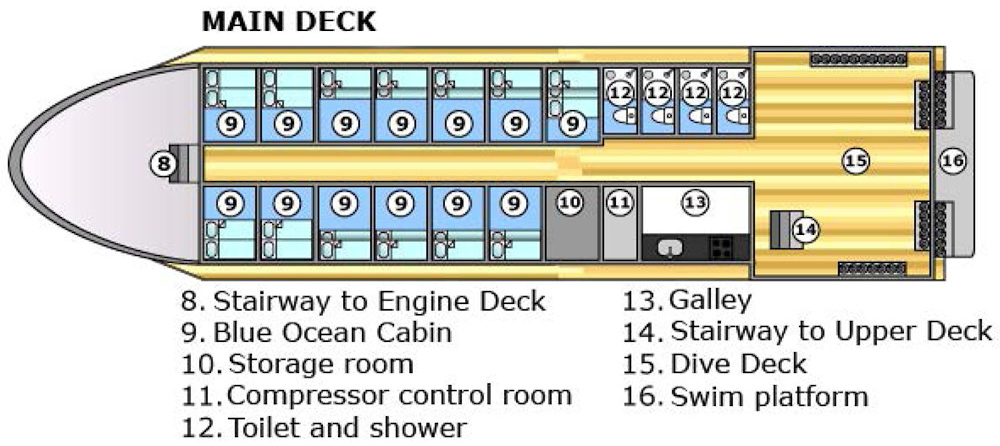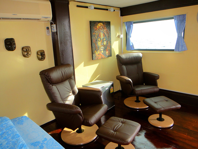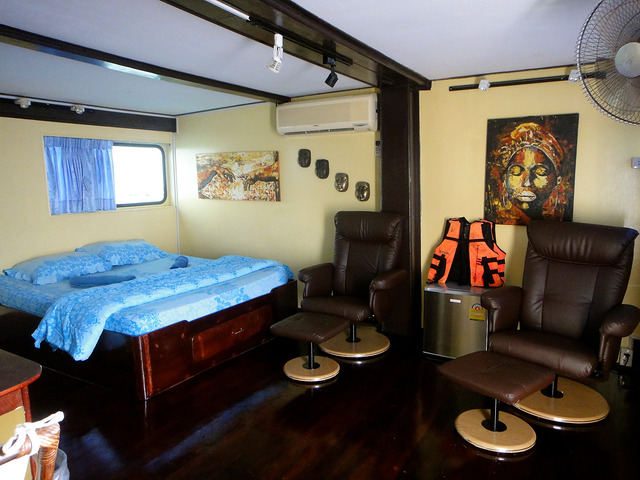 MV Oktavia has Blue Ocean Cabins (6 x double bed, 5 x bunk bed, 2 x triple berths) and Master Suites (x 2). Her nine standard cabins (called "Blue Ocean") are roomy, tidy and neat, come equipped with central air-conditioning as well as a fan, and have large windows offering plenty of natural light and a wonderful view of the Andaman Sea and the islands. The four fully-tiled shared bathroom and shower combinations are of European style and standard and come equipped with hot water showers. The two Master Suites, have double beds, a reading and lounge chair (pipe smoking only allowed outside, but bring your slippers), and private bathrooms.