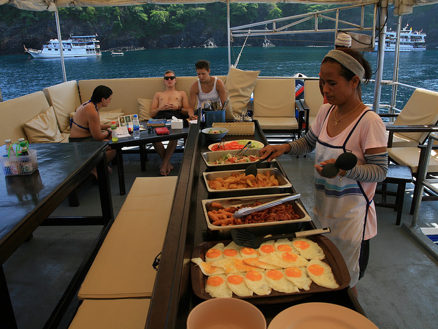 MV Oktavia features delicious buffets with Thai as well as Western dishes. Snacks are available all day and they also offer free hot beverages.