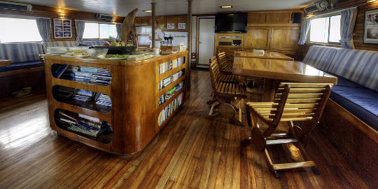 Main salon serving as lounge, theater, classroom, and dining room