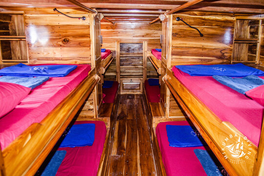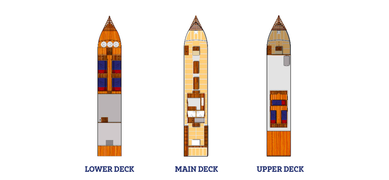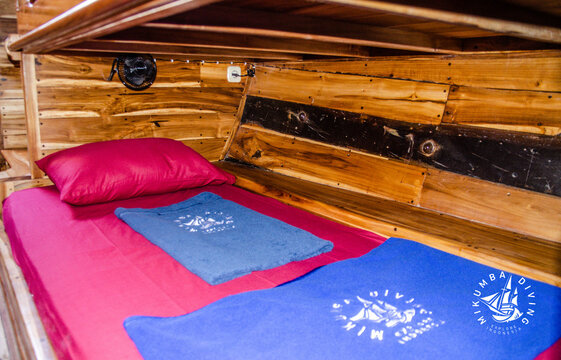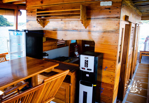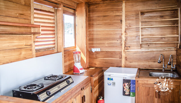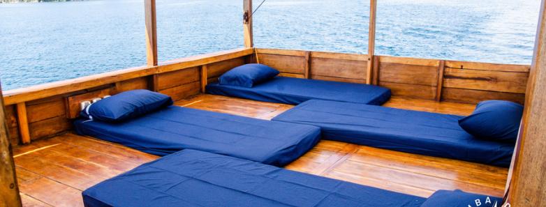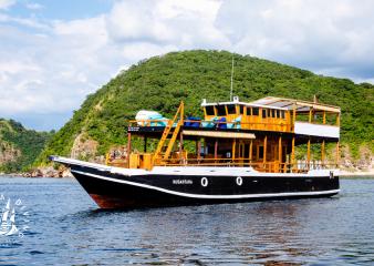 The Nusantara can comfortably accommodate up to twelve guests in their Dormitory-style Cabin and covered Sleeping Deck. The Dormitory Cabin sleeps eight guests and comes with privacy curtains and fans, while up to four guests can sleep on the Covered Deck with mattresses and sleeping bags. Power sockets are made available to all guests, as well as safe and secure equipment storage. There are also two shared western-style bathrooms complete with hot water for the guests.