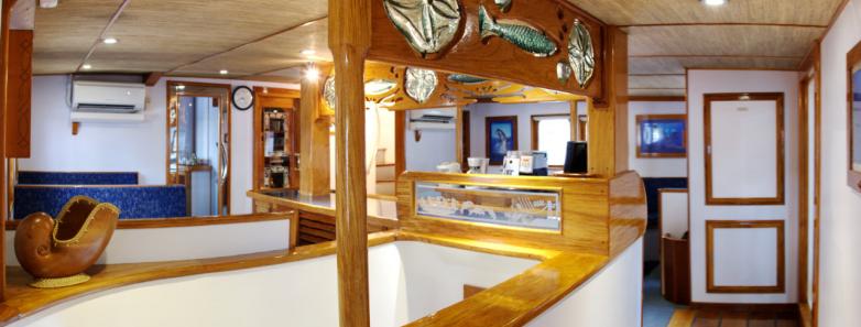 Ocean Hunter owner and renowned chef and cookery writer Tova Har-el has developed a delicious gourmet menu. She has not only had extensive experience as a chef, but specifically as a liveaboard chef! As a dedicated diver herself who knows the importance of low-fat, fiber-rich meals, Tova designed the menu with international cuisines such as Palauan, Italian, Mediterranean, French and Japanese (with fresh sashimi and sushi), and with a bit of her own style as well. She has worked extensively with our cook Arlee. Ocean Hunter III also offers a full bar and refrigerator of drinks for guests. Mineral water is always free, however, we must charge $1.50 for soft drinks and $3.00 for beer.