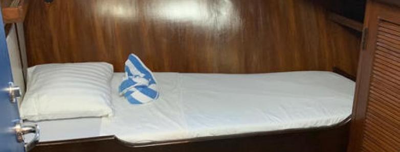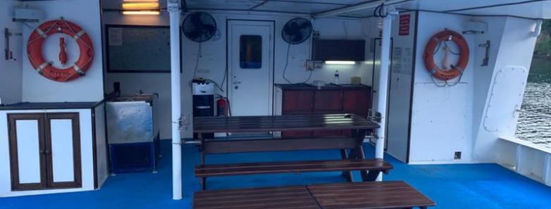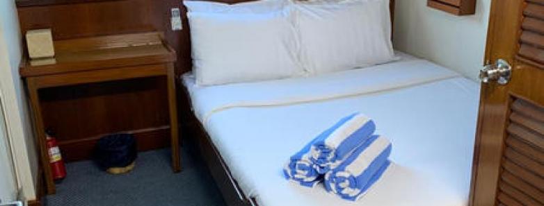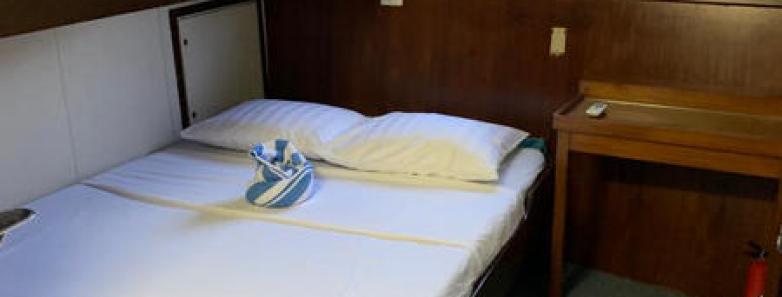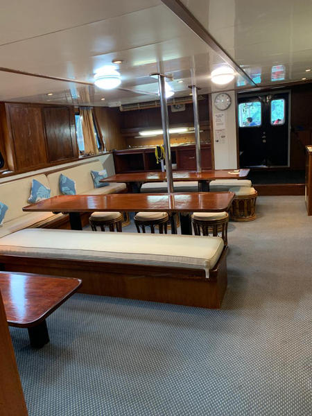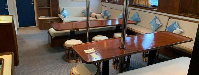 The Ocean Rover can comfortably accommodate up to 16 guests in its 8 cabins. Three of the cabins feature large double beds while the rest contain 2 twin beds. There are also large panoramic windows in all the cabins except two of the forward cabins, which have dual portholes. All the cabins are located on the main and upper decks to ensure no distrubance from noises the engine room. All cabins also come complete with a private en-suite bathroom, individually controlled AC, and lots of storage space.