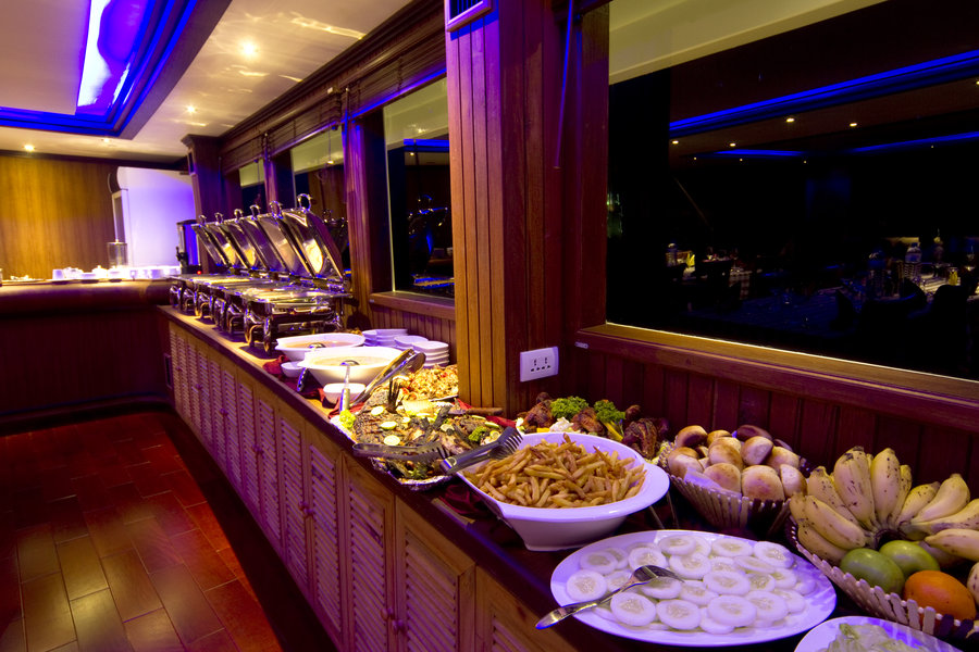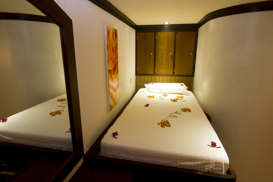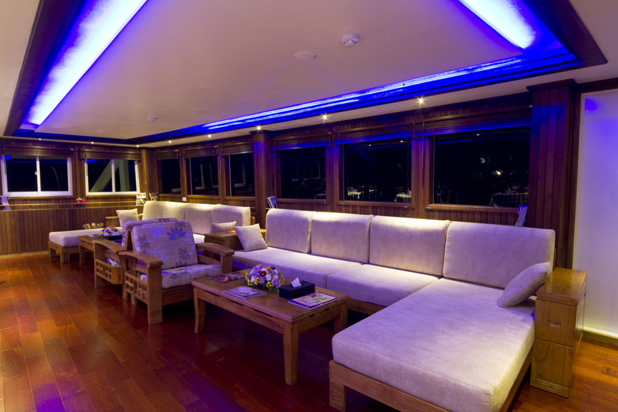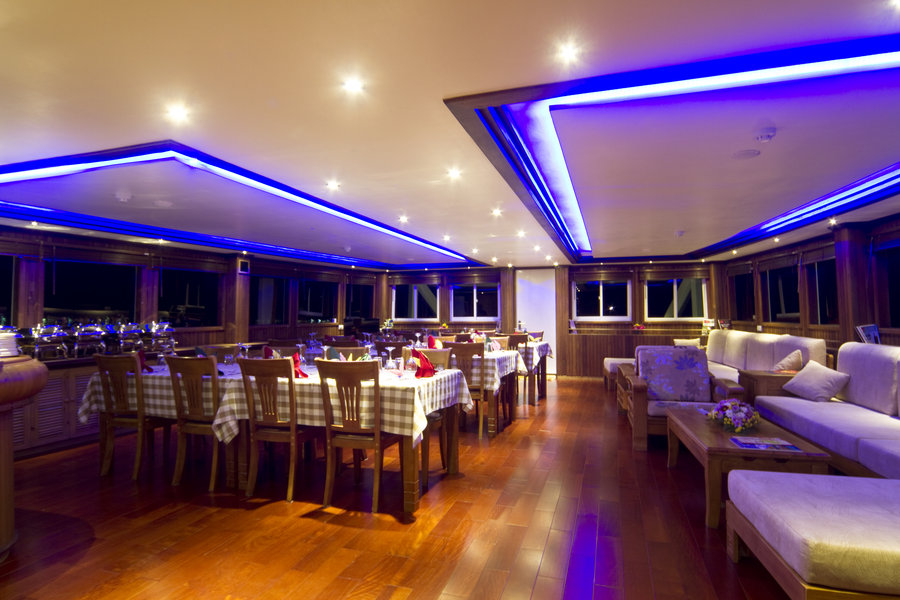 The Ocean Sapphire houses a total of 11 cabins, 7 on the Lower Deck and 4 on the Upper Deck. Guests can choose among cabins with the following configurations: double-bedded cabins (on the Upper Deck), cabins with a double bed and a single bed, cabins with two single beds, and a family cabin with a small double bed and a single bed (all on the Lowe Deck.) The Upper Deck cabins come complete with an LCD TV, private climate controls, an attached bathroom/toilet in each cabin, a bathtub in the family cabin, a dressing table & chair in all cabins, a wardrobe, individually controlled lights, and a personal safe. The Lower Deck Cabin facilities include private climate controls, an attached bathroom/toilet in each cabin, a bathtub in the family cabin, a dressing table & chair in all cabins, a wardrobe, individually controlled lights, and a personal safe.