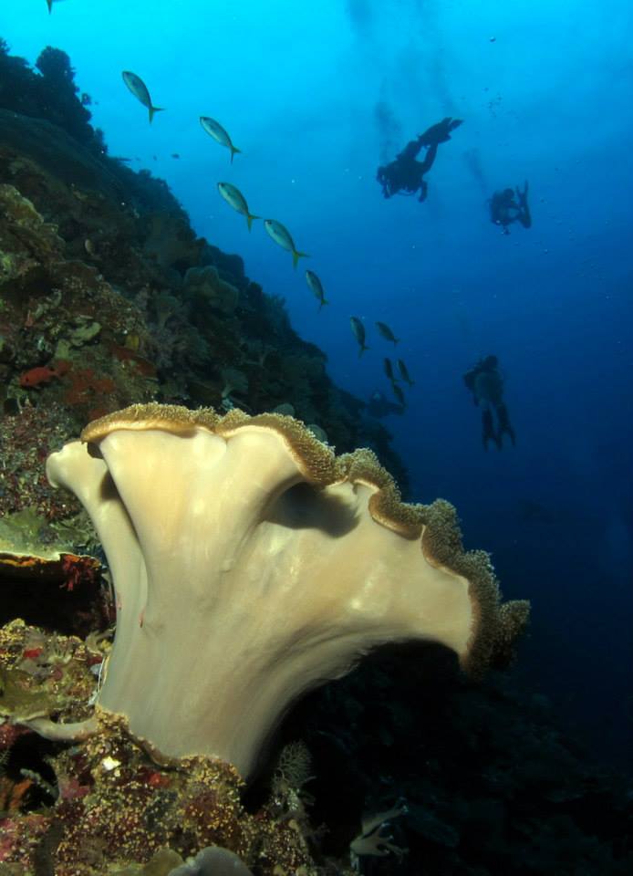 Situated on a current-swept corner of a steep drop-off, it is a natural gathering point for reef fish of every description, dense schools of jacks, snappers and barracuda, and a healthy population of white-tip and gray reef sharks, as well as Napoleon wrasse and many other species.
