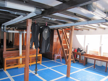 The air-conditioned cabins with en-suite bathrooms are sleek yet cozy, a sanctuary to welcome you home after a long excursion undersea. We have 7 cabins; 2 Trevally Deluxe Cabin with doubled bed and two single bed in upper deck; 1 Manta Suite Cabin in lower deck with one single bed and double bed; 4 Seahorse standard cabin with bunk bed in lower deck. All cabins in lower deck have portholes and windows. Upper deck cabin has huge window.