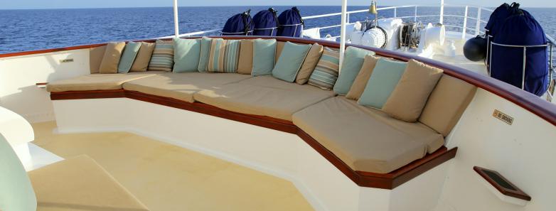 Located at the yacht's stern, the Deluxe Cabin is perfect for dive buddies looking for spacious room arrangements. The efficient layout features two beds (one wide enough for two people, the other accommodates one person) and built-in drawers. A small loveseat provides a great space to maintain your dive log or catch up on some work. The cabin's bathroom has been newly remodeled.